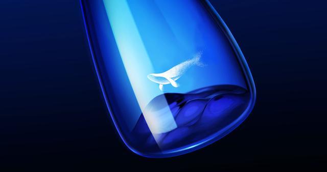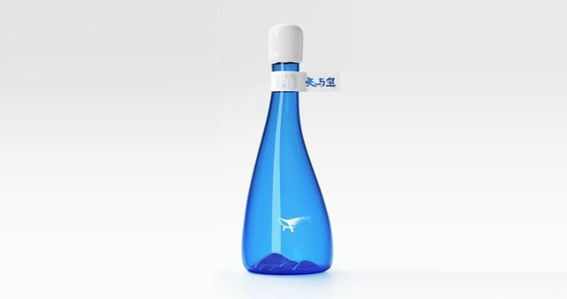 凌云将容器设计成非对称的流线型形态,将瓶子的底部内凹造型做成了连绵起伏的山峦,配合瓶身上的“鲸鱼”图案的透明标签,展现了一种鱼在空中遨游的场景,打造好产品的独有气质。